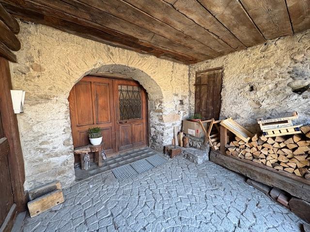 Appartamento in baita caratteristica, con muri in pietra e travi in legno a vista, arricchita di archi, tipico delle architetture montane. L'ingresso principale, presenta una porta in legno massiccio con un arco in pietra e una piccola tettoia quale riparo. L'ambiente esterno pavimentato con cubetti di taglio irregolari contribuisce al fascino rustico.