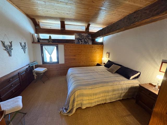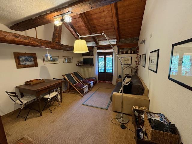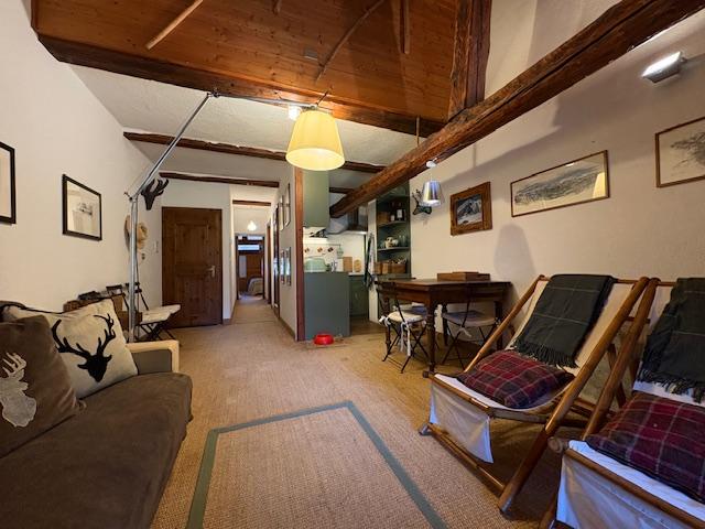 Il bilocale, si presenta con un'atmosfera calda e accogliente, dominata dal legno e da elementi rustici. Il soffitto è caratterizzato da imponenti travi in legno a vista, che conferiscono un forte senso di tradizione e solidità, tipico delle baite. L'orditura lignea è ben integrata nel soffitto mansardato.