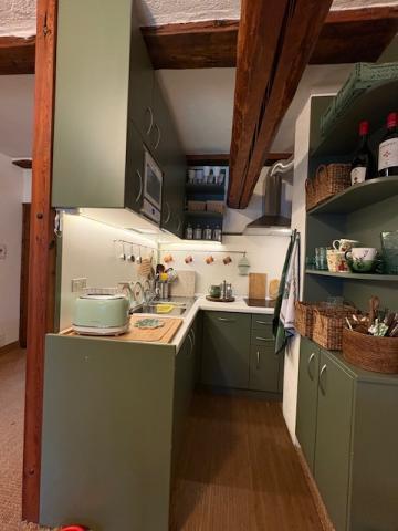 In contrasto all'aspetto rustico, abbiamo una moderna cucina a vista ben progettata, che si inserisce perfettamente per le necessità funzionali d'uso.