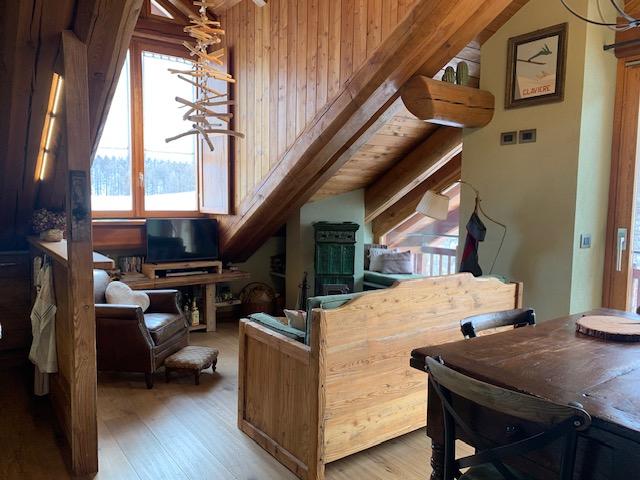 Terminata la costruzione nel 2015, questa offerta è composta da un preingresso, un corridoio che da accesso alle 2 camere da letto, al bagno ed al soggiorno con zona pranzo ed angolo cucina. Molti i particolari che rendono questo immobile unico: dal citato preingresso per scarpe e giacche, ad un armadio riscaldato per trovare le tenute da sci asciutte e calde pronte all’uso, alle zone di sottotetto armadiate per ordinare tutto ciò che deve essere a portata di mano ma rimessato; nel soggiorno trovano spazio una stufa a legna dal caldo coccolante, una cucina attrezzata con quanto necessario per esaltare le doti dello “chef”, la zona pranzo con un tavolo comodo per la famiglia, ma anche per le serate con gli amici; importanti abbaini sono presenti nelle camere e nel soggiorno per una vista che si spinge fino al Monte Fraiteve, crocevia della Vialattea, a cui si aggiungono porte finestre e triangoli vetrati che regalano viste sul circondario suggestive. Le unicità non finiscono qui: trattandosi di una mansarda il progettista ha voluto riprendere le caratteristiche delle vecchie baite montane con gli ingressi dei fienili a monte della casa, che grazie ad una passerella si può raggiungere un giardino pertinenziale di circa 60 mq dotato di un’ottima esposizione al sole tutto l’anno. E se poi vogliamo essere corretti lo stabile è dotato di ascensore e dal garage/box auto si accede tramite spazi condominiali coperti alle scale che conducono agli appartamenti. La tecnologia è stata utilizzata per un controllo a distanza del riscaldamento, rigorosamente a pavimento, pannelli solari integrano l’acqua calda sanitaria condominiale ed il riscaldamento. Un sistema di VMC (Ventilazione Meccanica Controllata) garantiscono il giusto equilibrio igrometrico all’interno dei vani senza dispersione del prezioso calore.